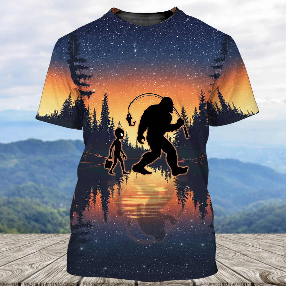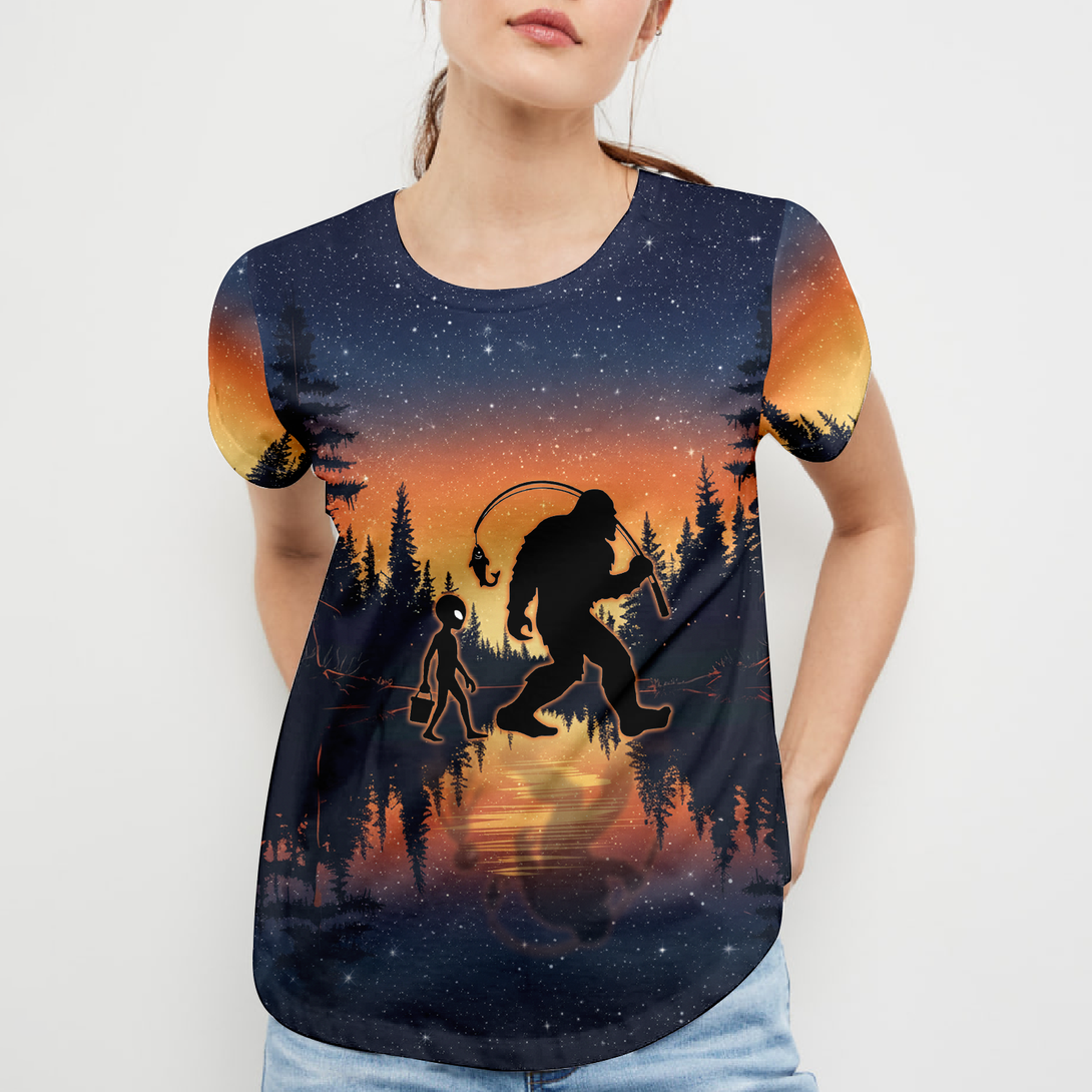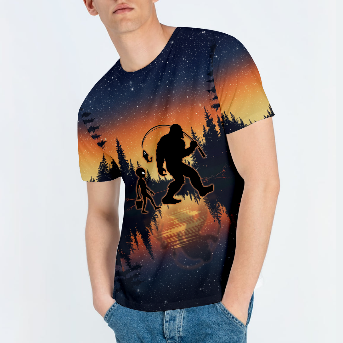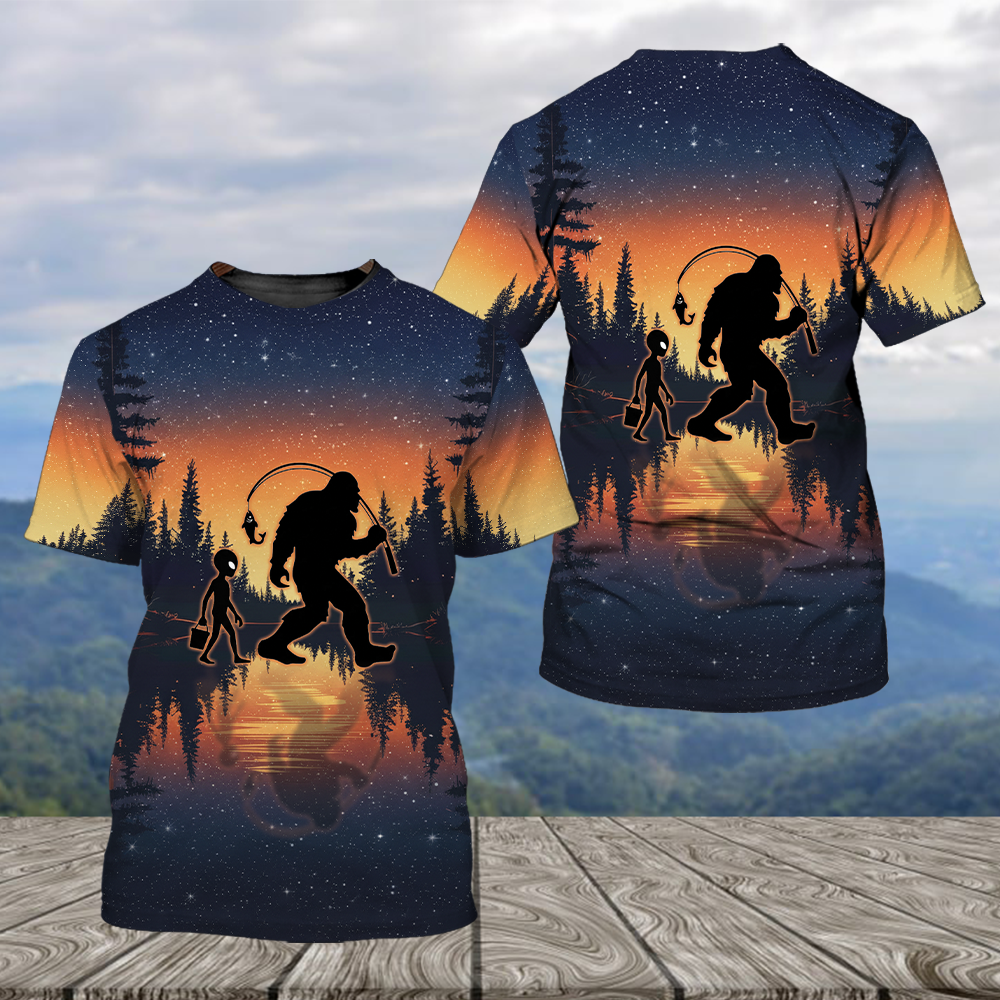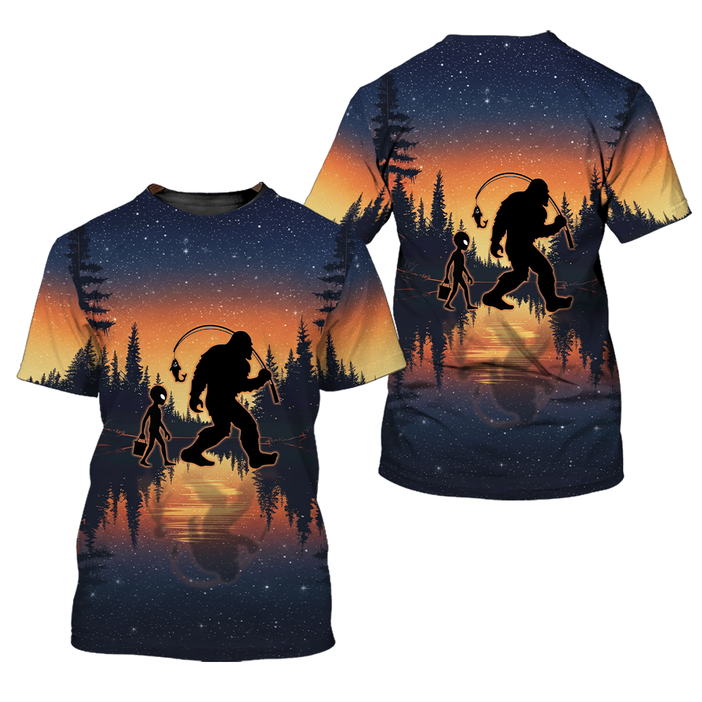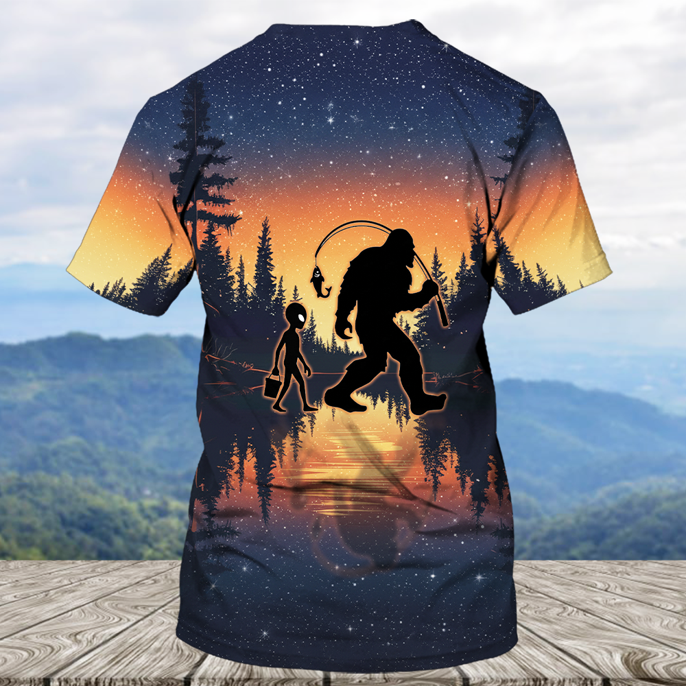 Bigfoot And Alien Go Fishing Night Forest All Over Print Shirt