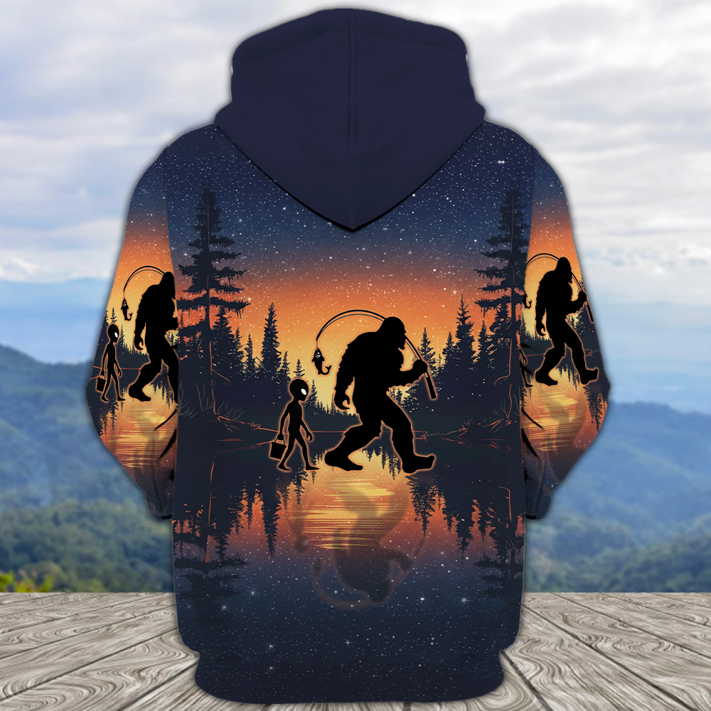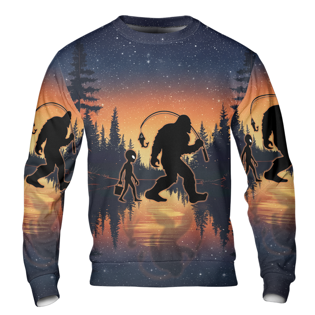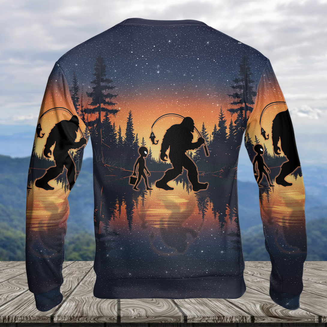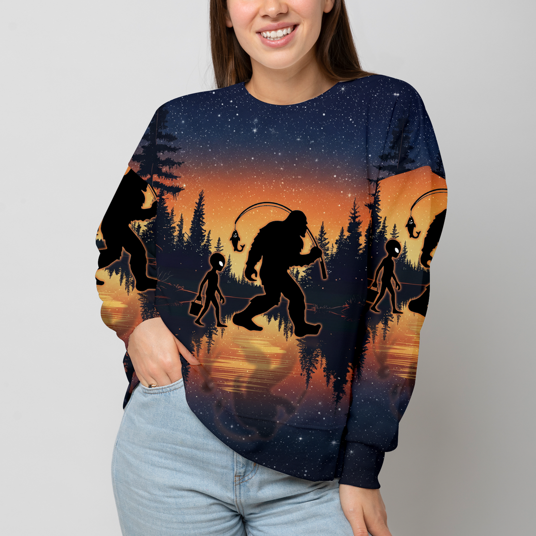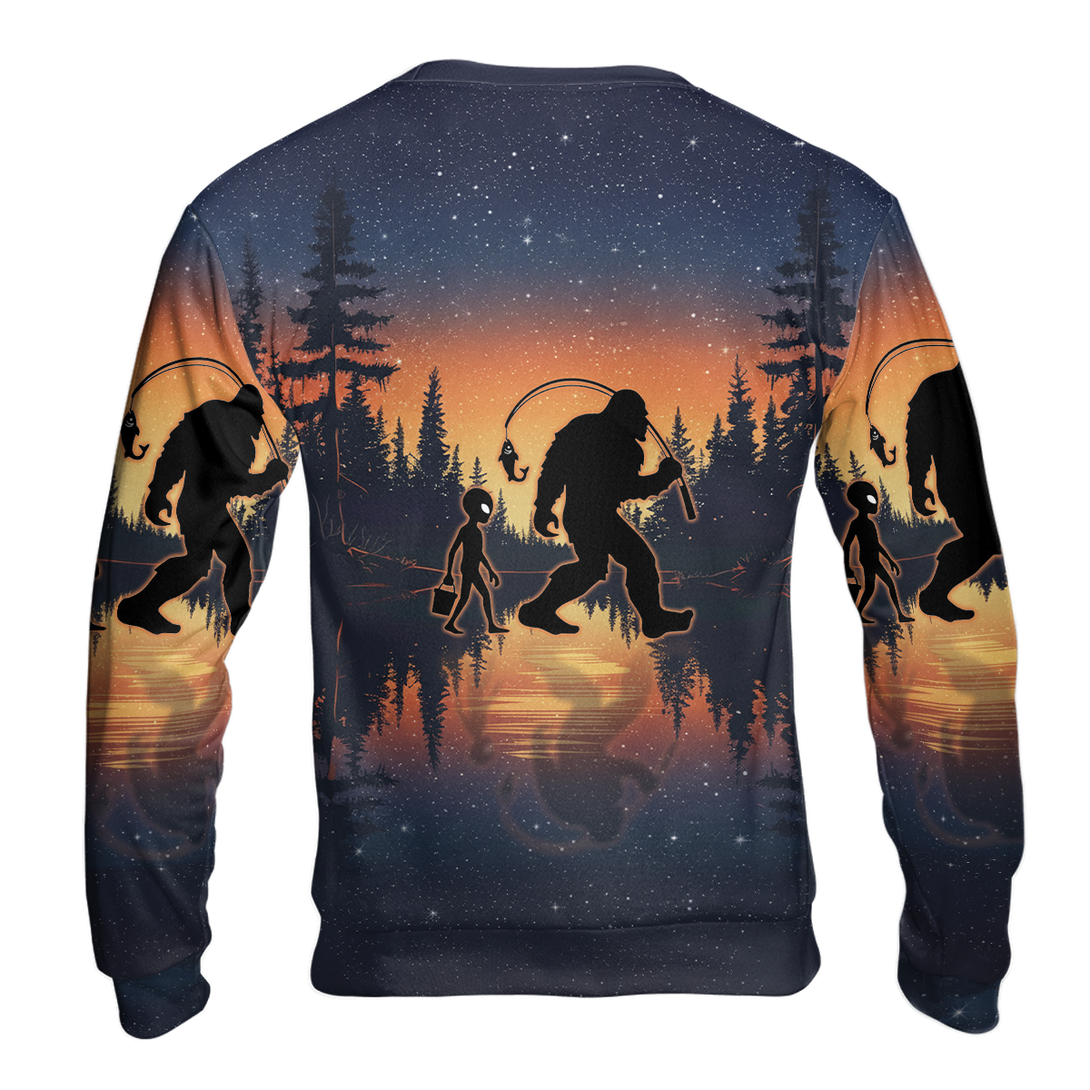 Bigfoot And Alien Go Fishing Night Forest All Over Print Shirt