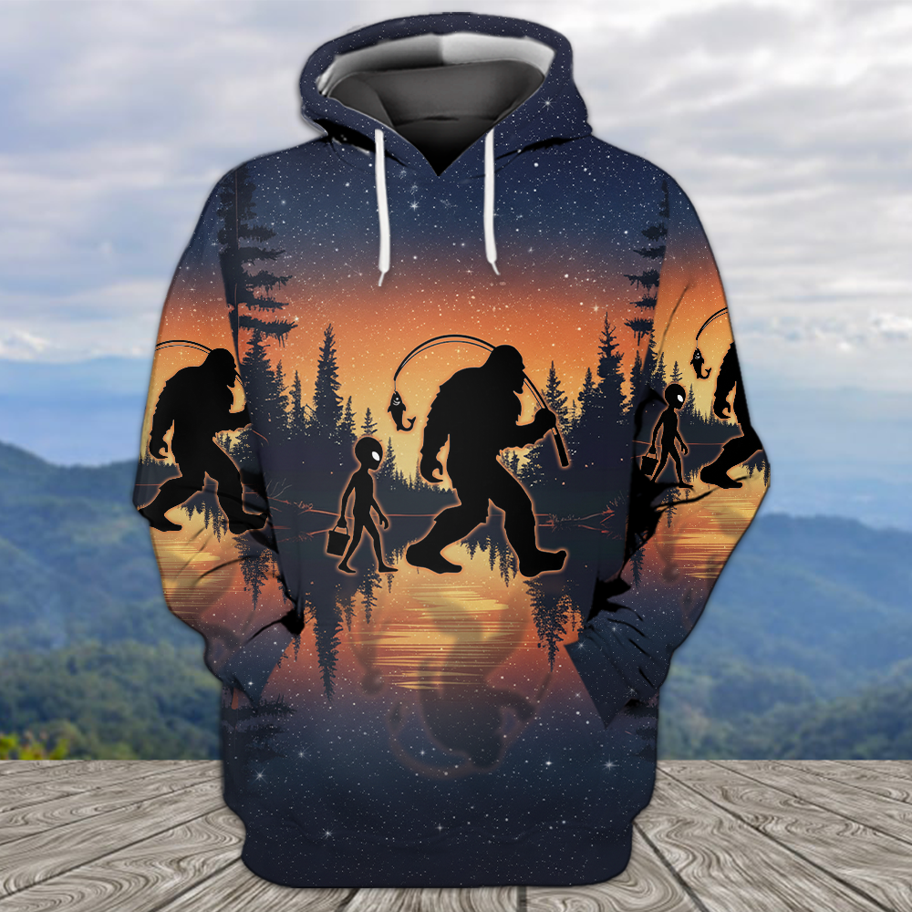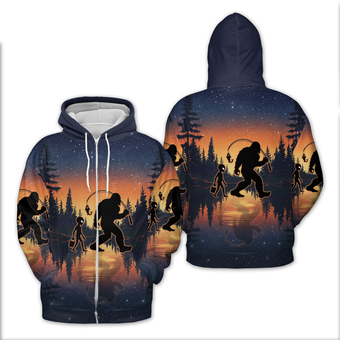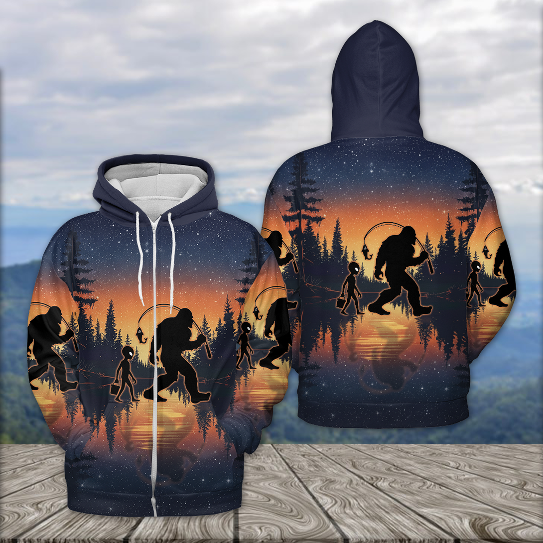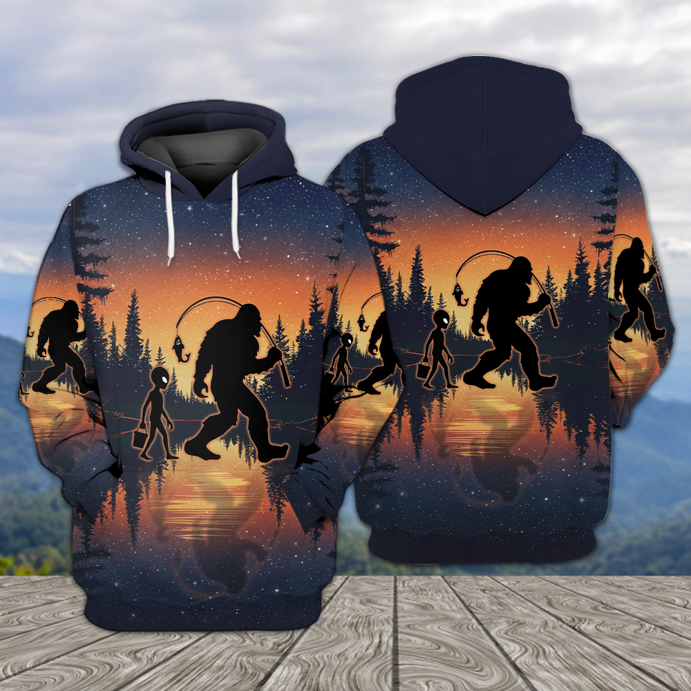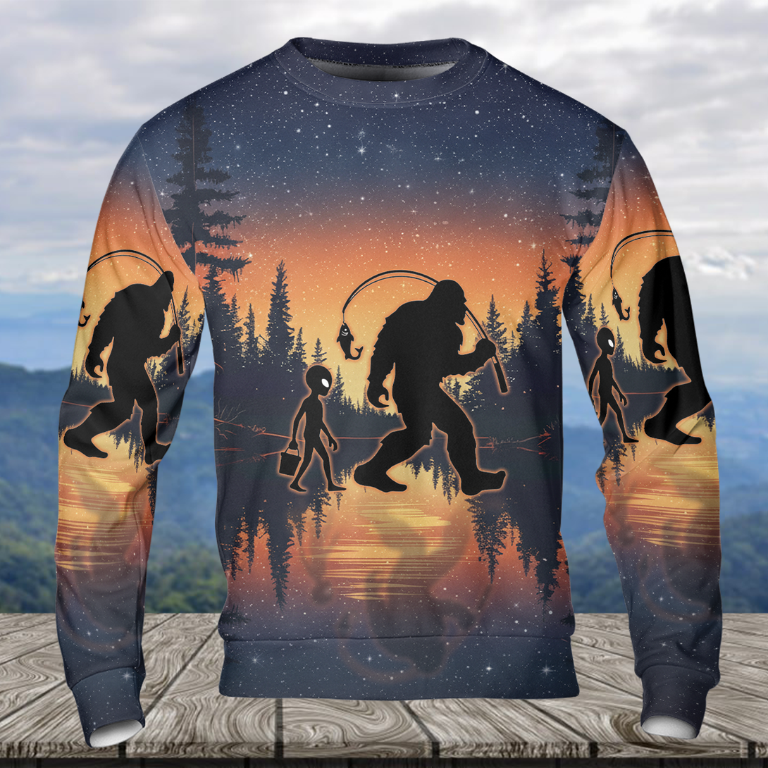 Bigfoot And Alien Go Fishing Night Forest All Over Print Shirt