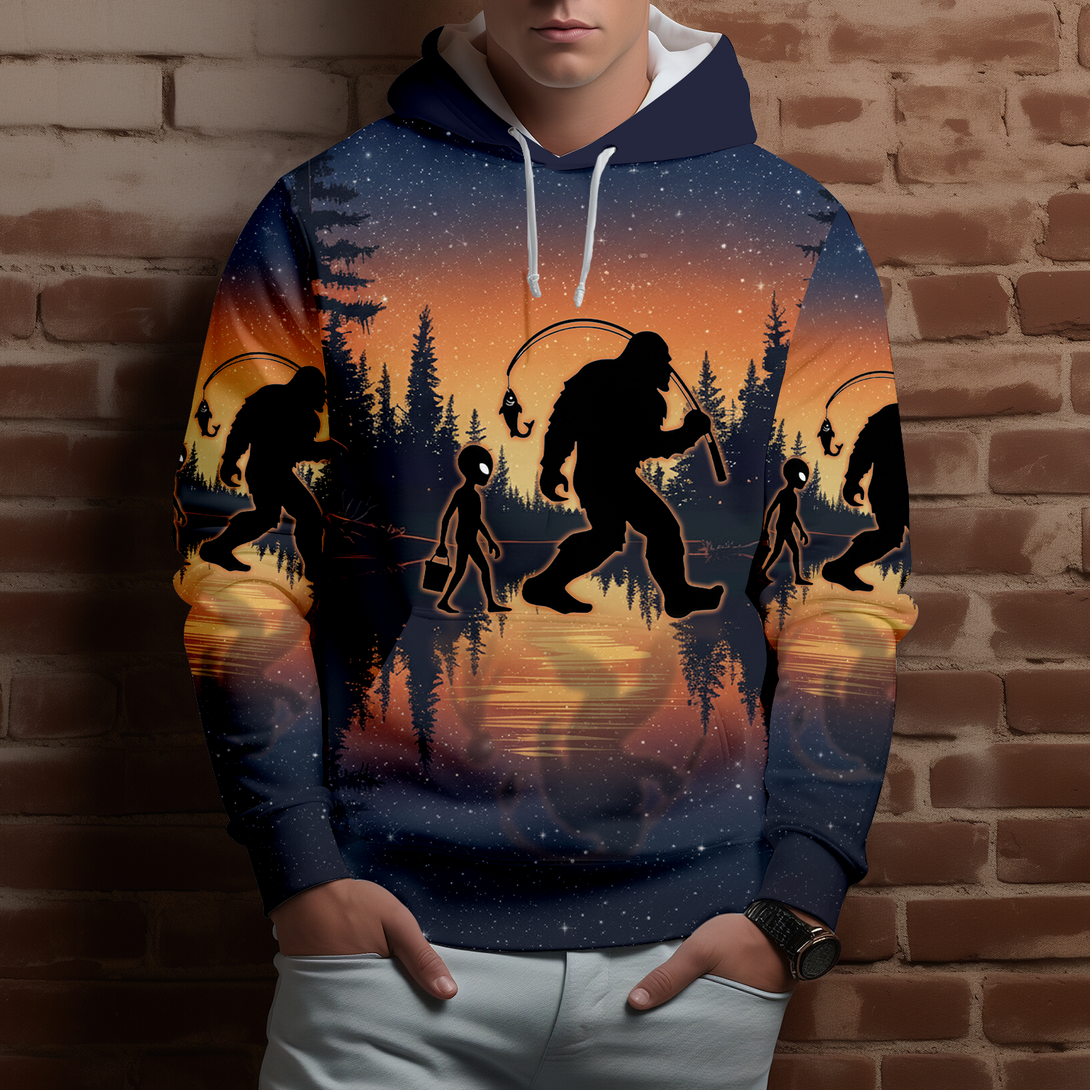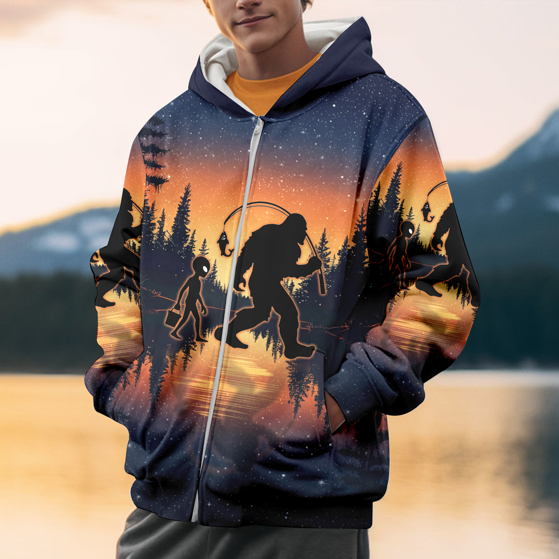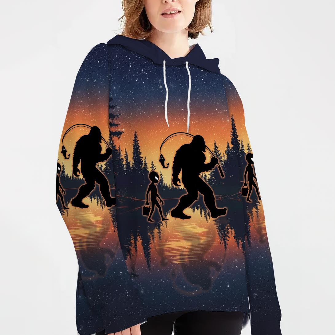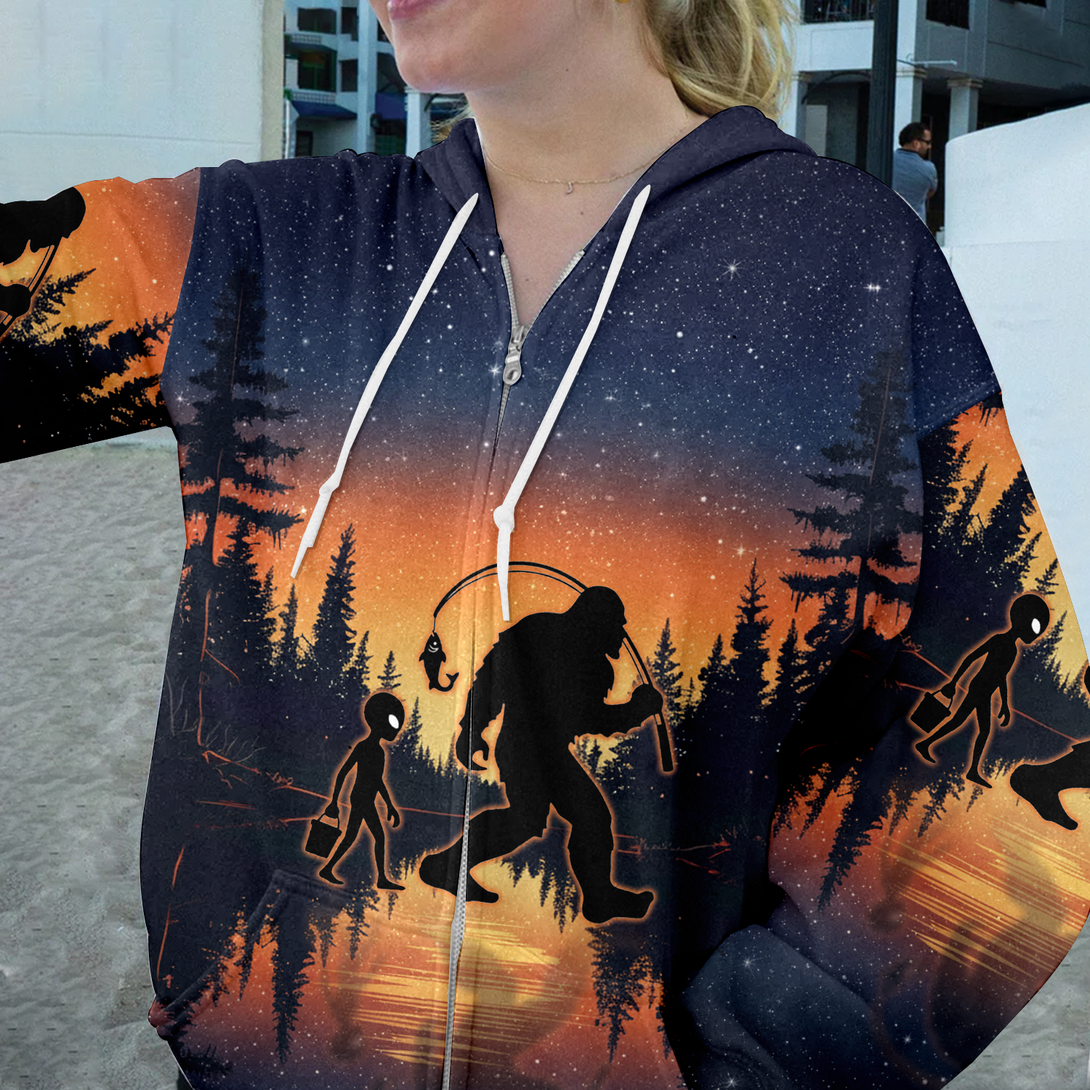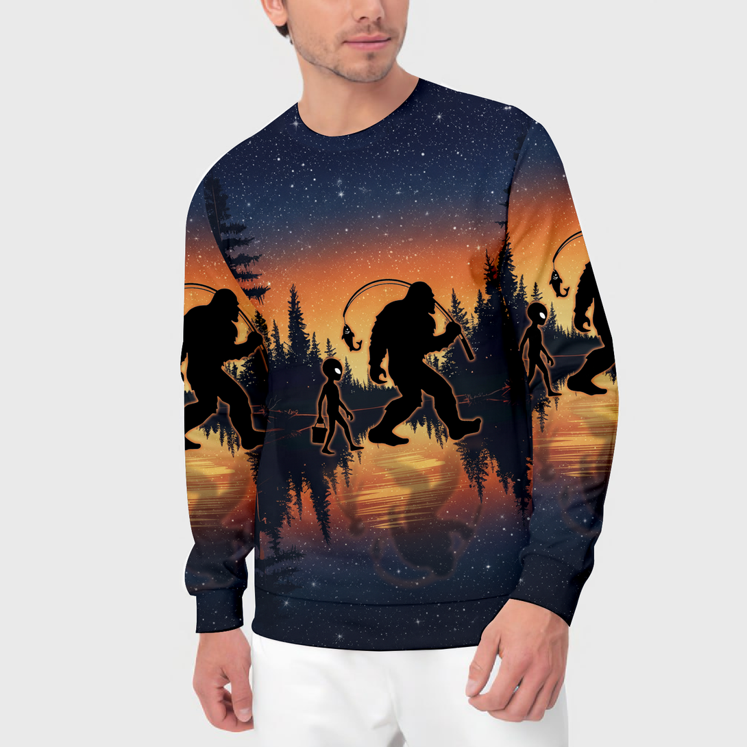 Bigfoot And Alien Go Fishing Night Forest All Over Print Shirt