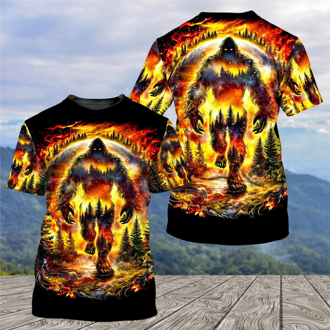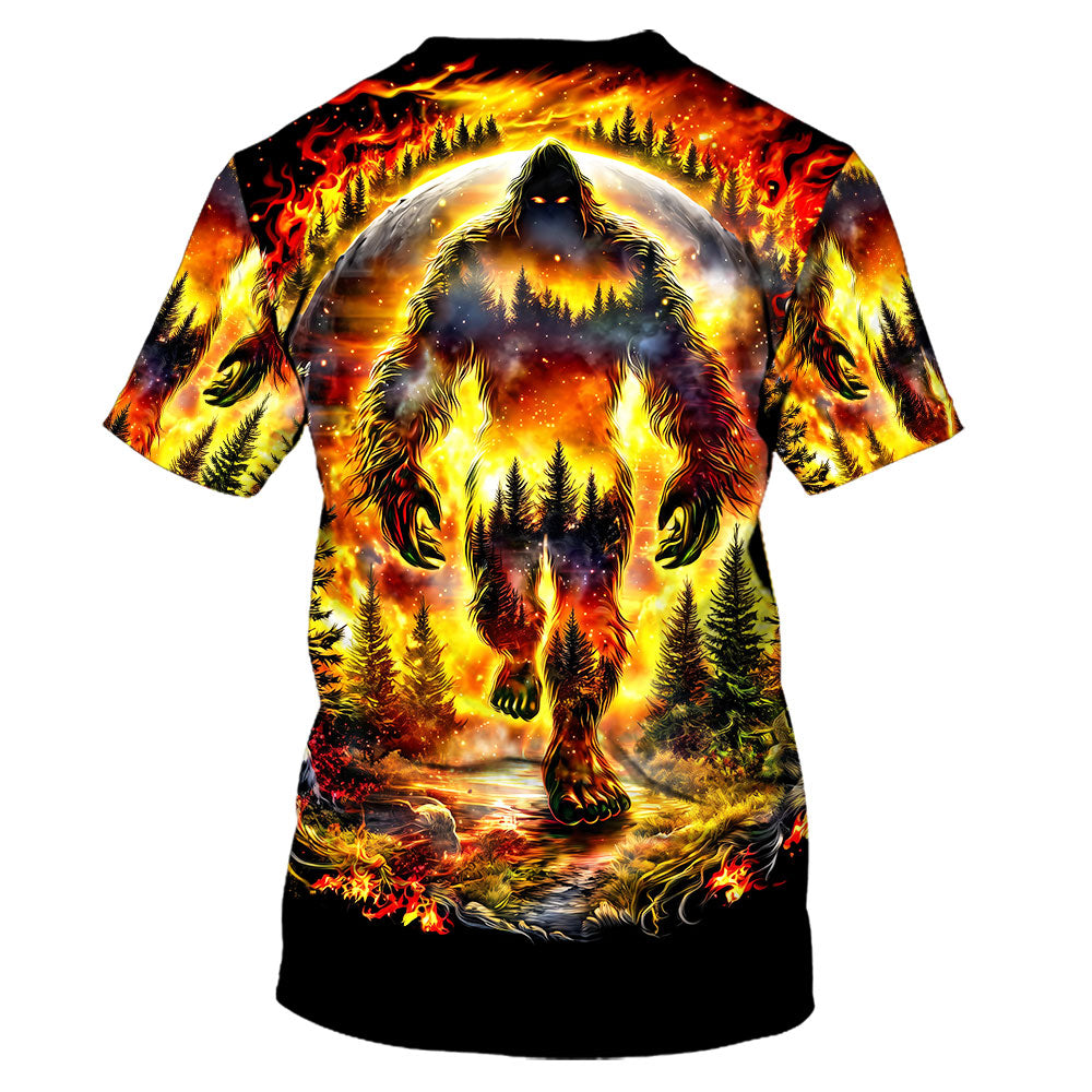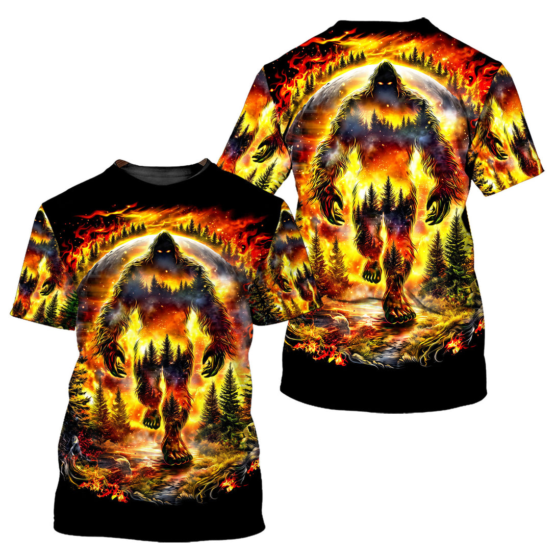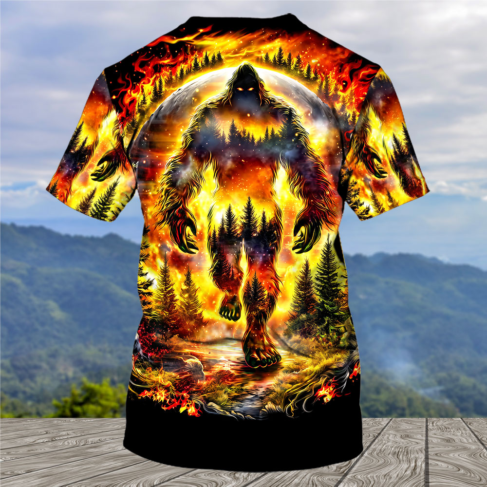 Bigfoot In The Forest Fiery All Over Print Shirt