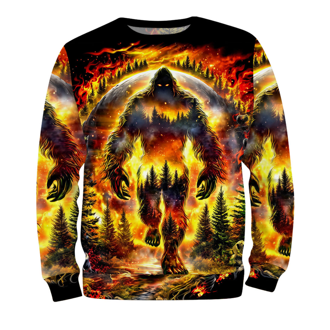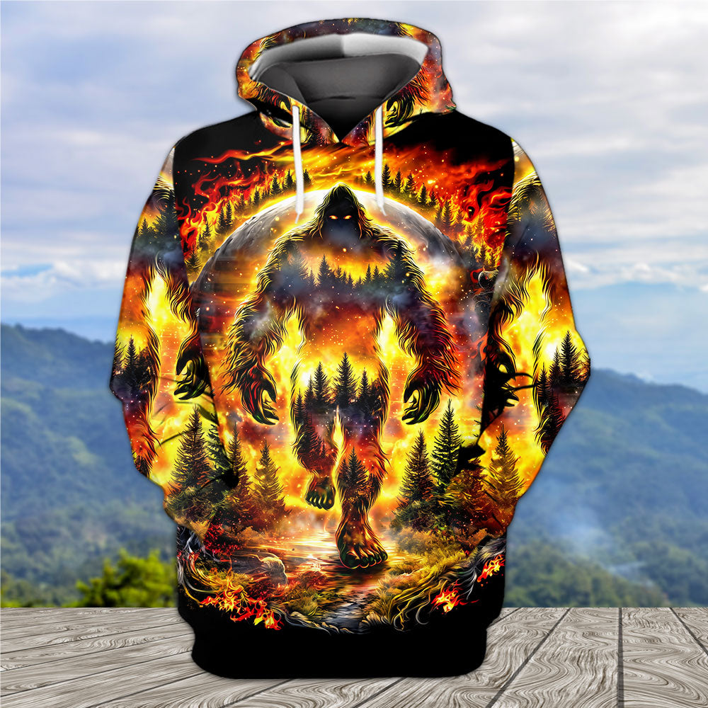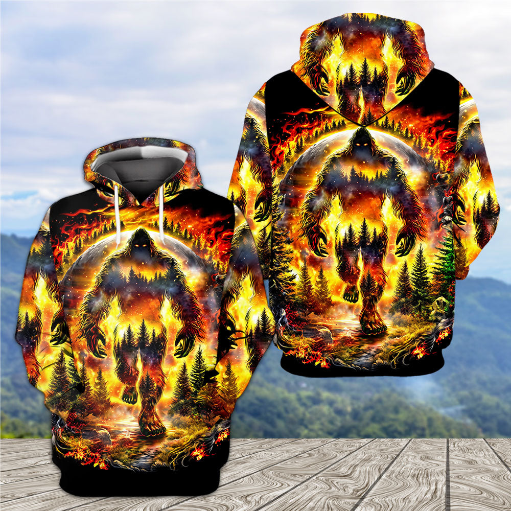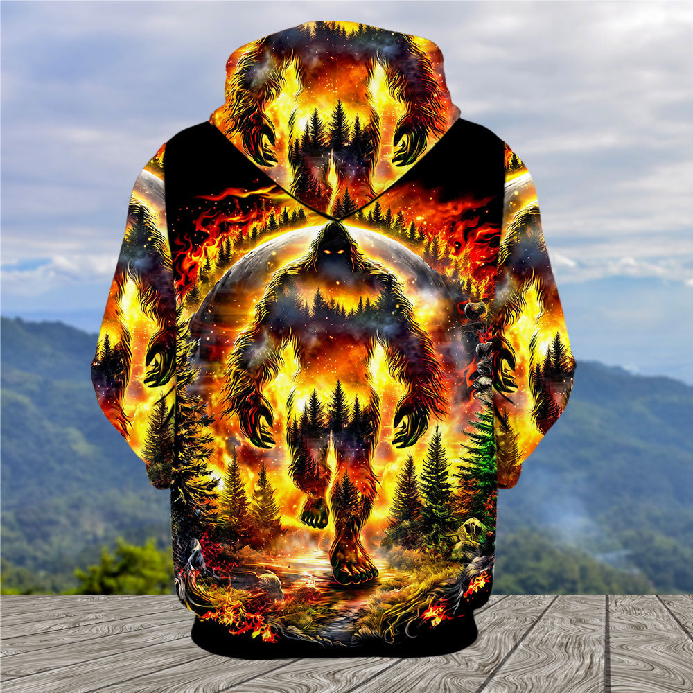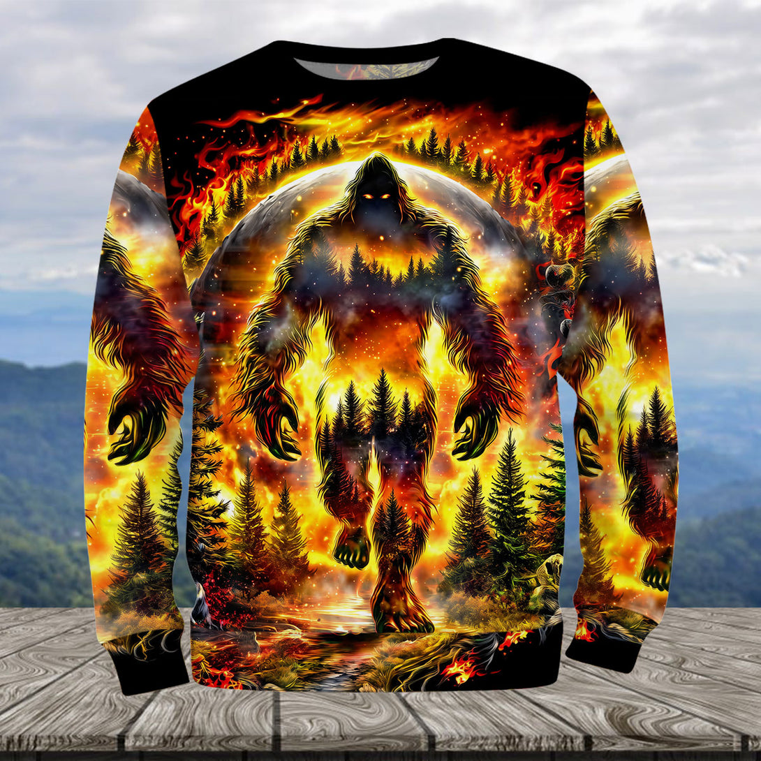 Bigfoot In The Forest Fiery All Over Print Shirt
