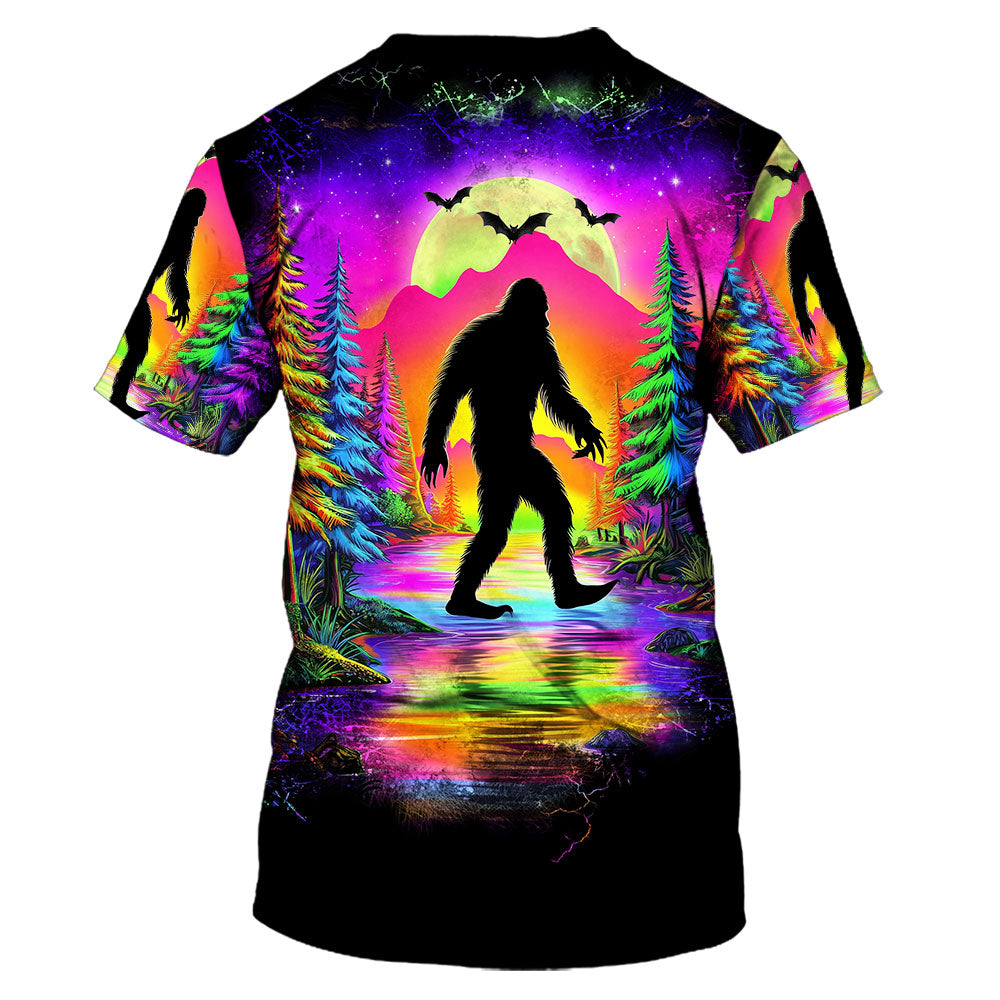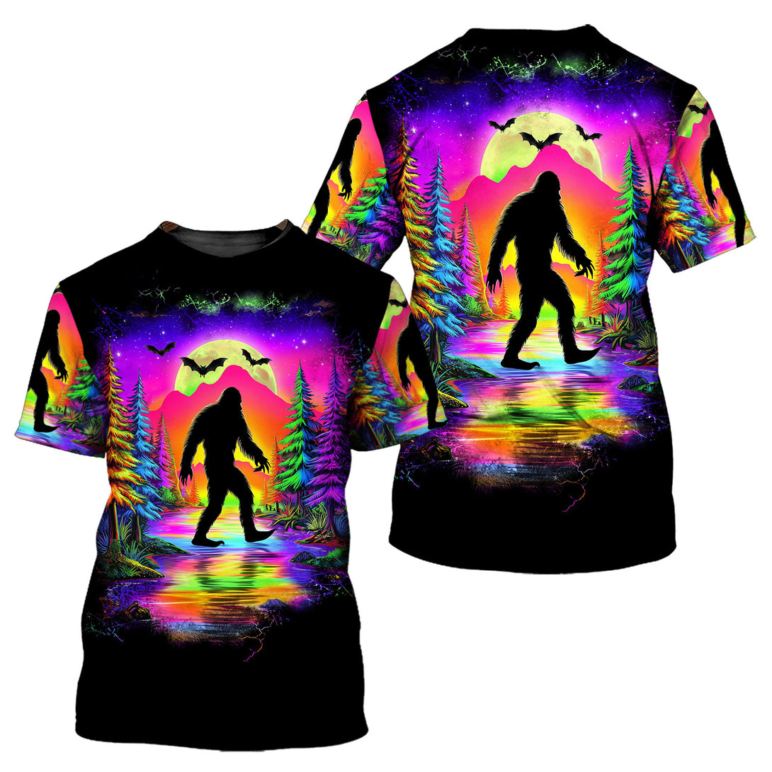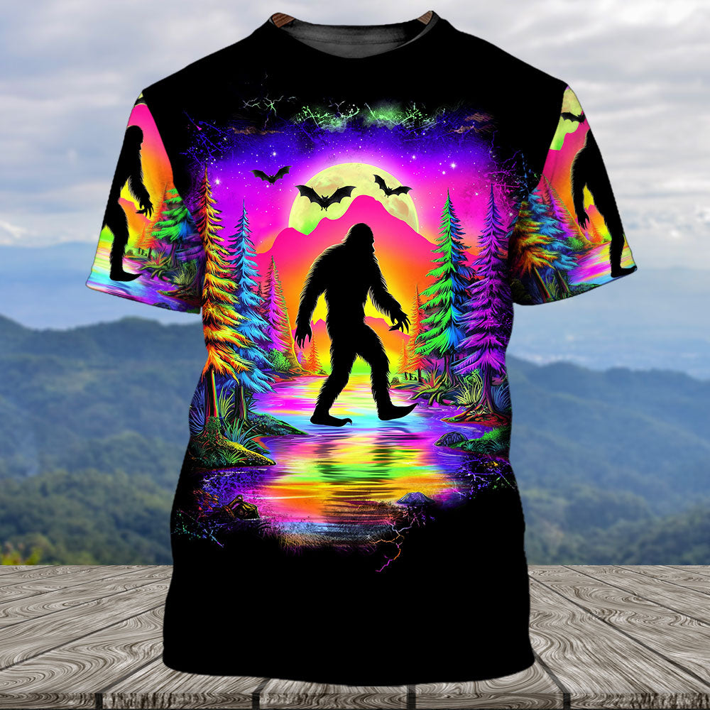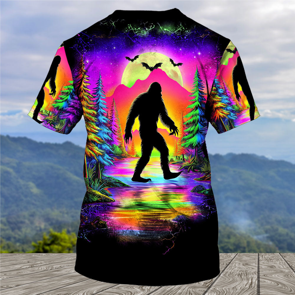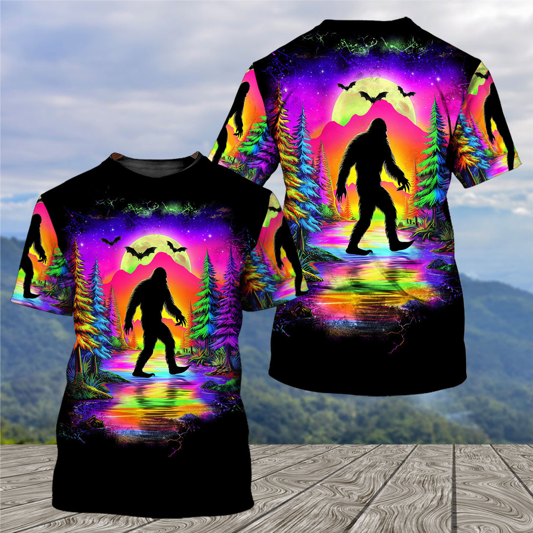 Bigfoot Walking Along The Riverbank In A Moonlight Forest All Over Print Shirt