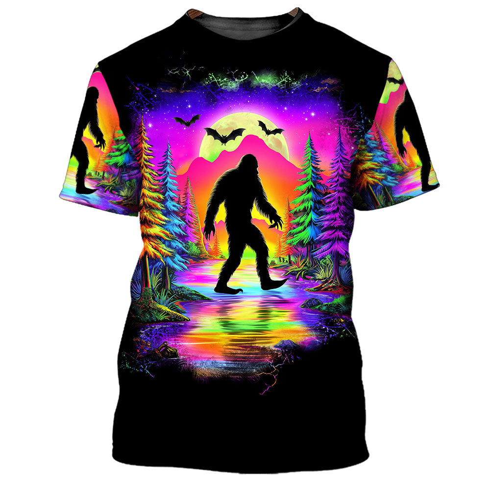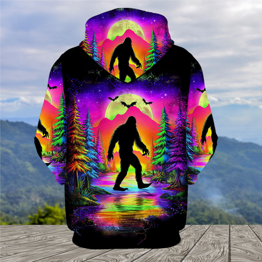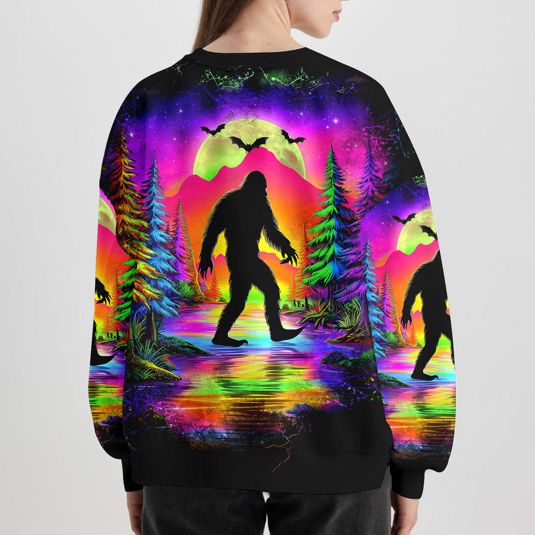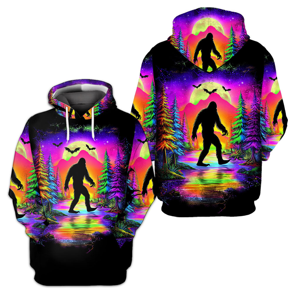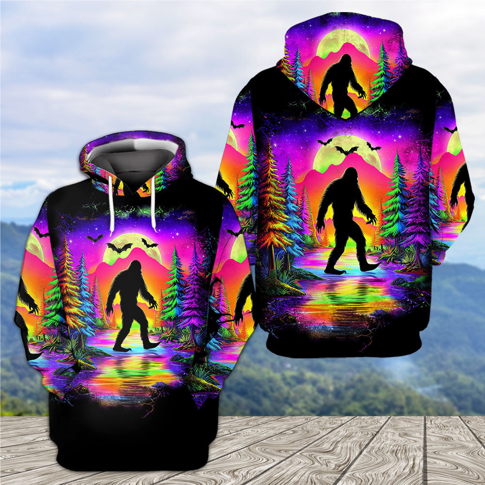 Bigfoot Walking Along The Riverbank In A Moonlight Forest All Over Print Shirt