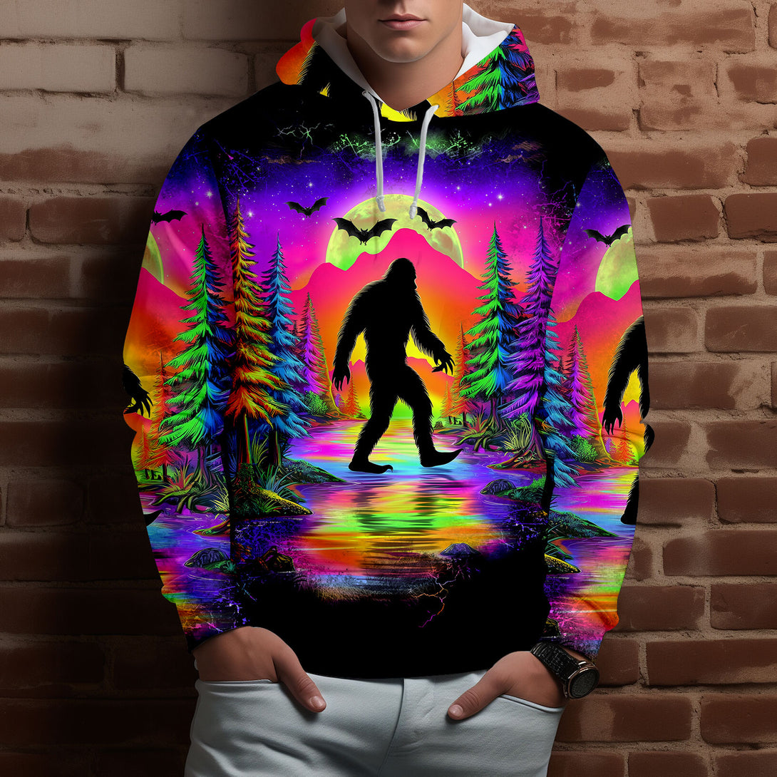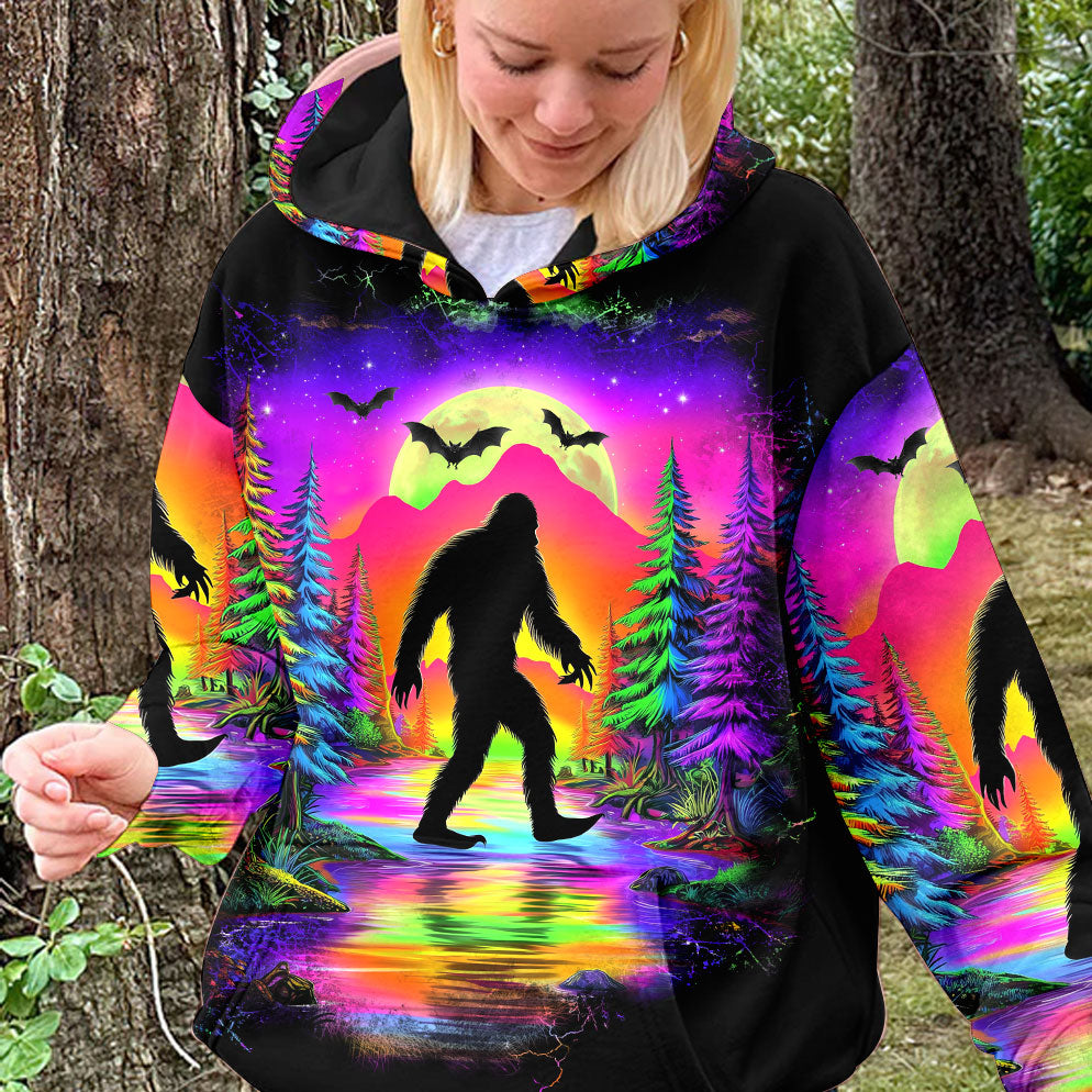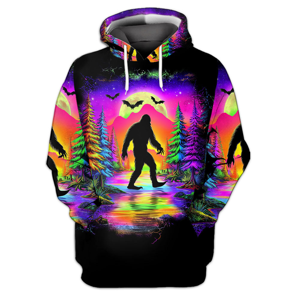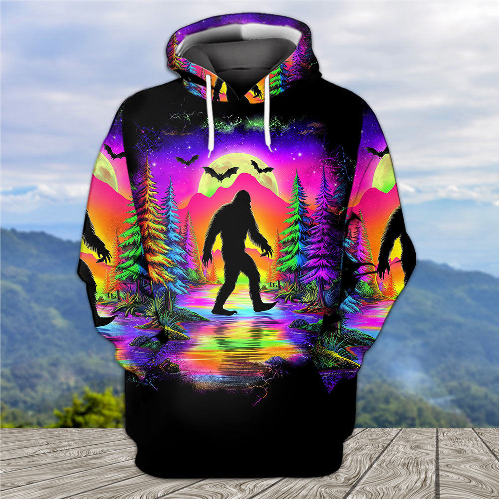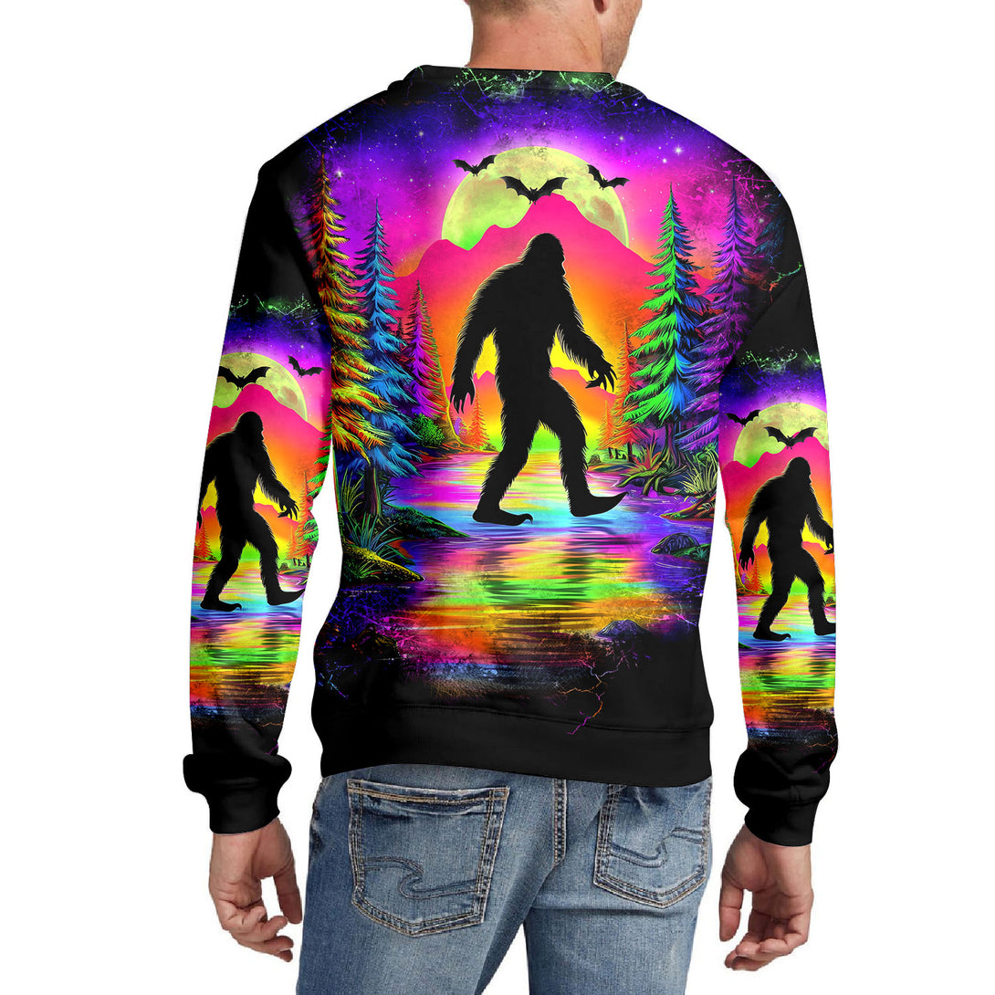 Bigfoot Walking Along The Riverbank In A Moonlight Forest All Over Print Shirt