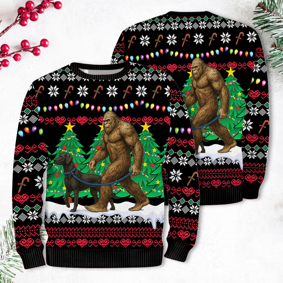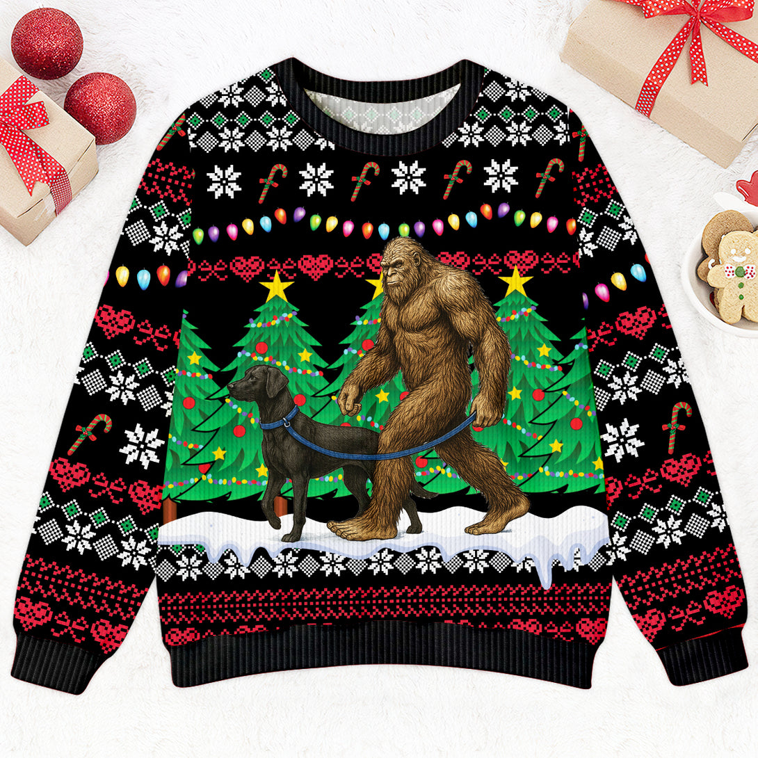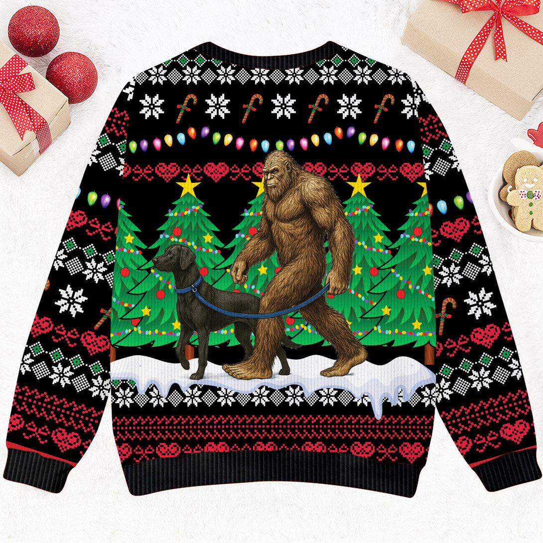 Bigfoot Walking His Dog Through The Snow Christmas Ugly Sweater