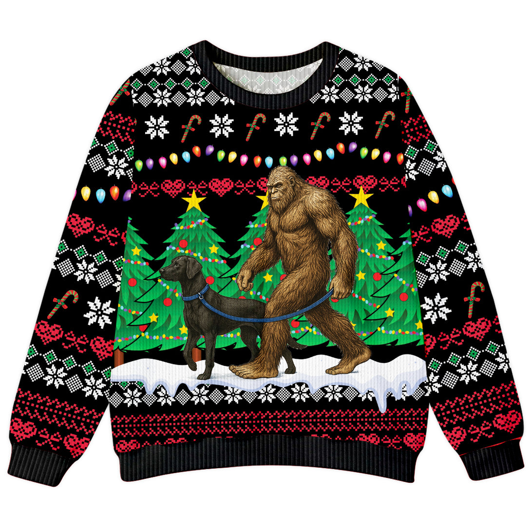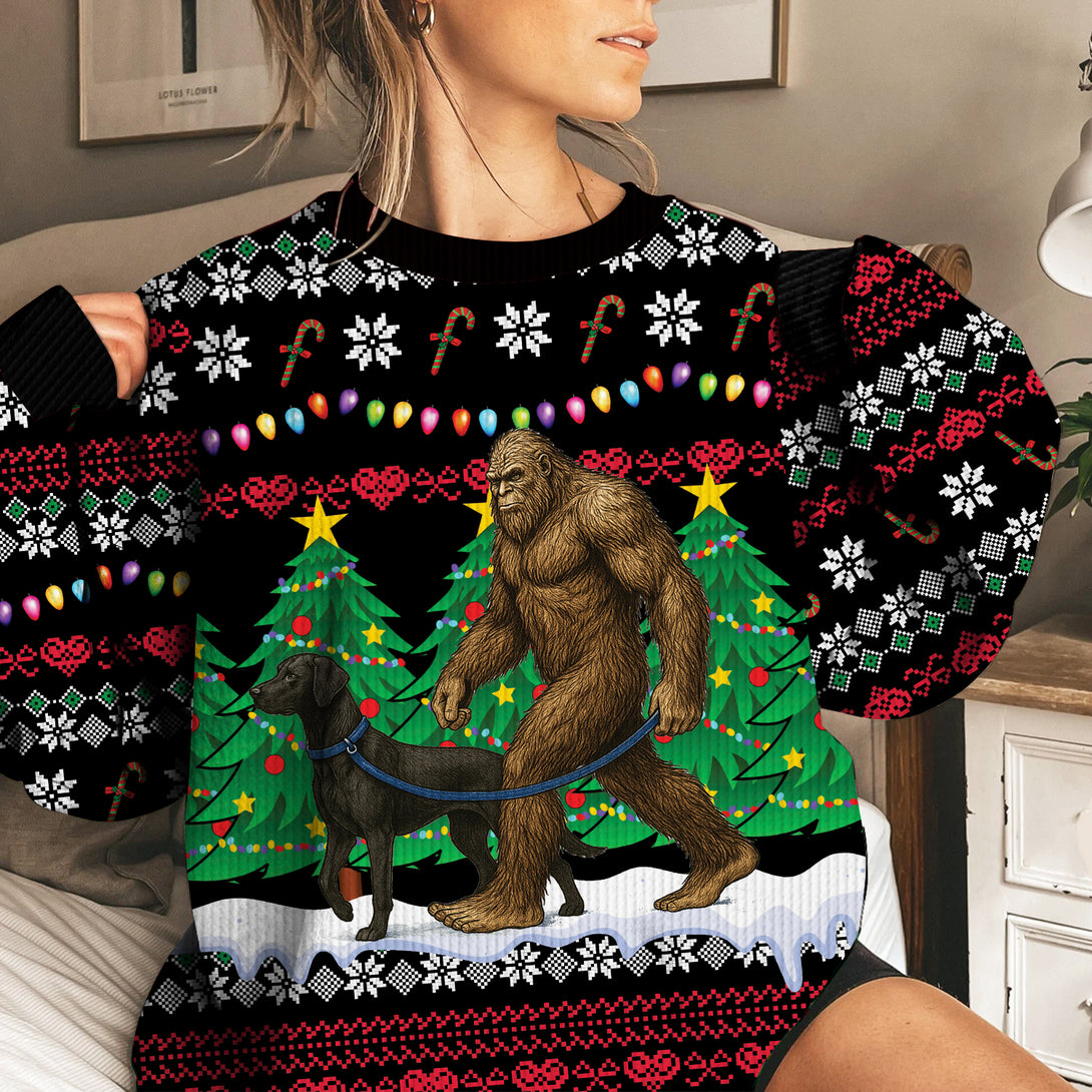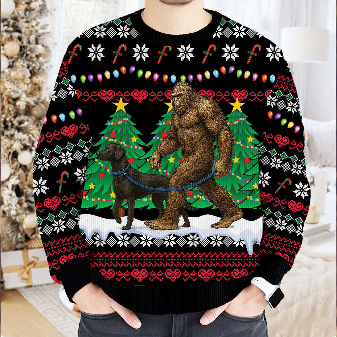 Bigfoot Walking His Dog Through The Snow Christmas Ugly Sweater