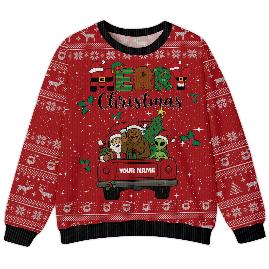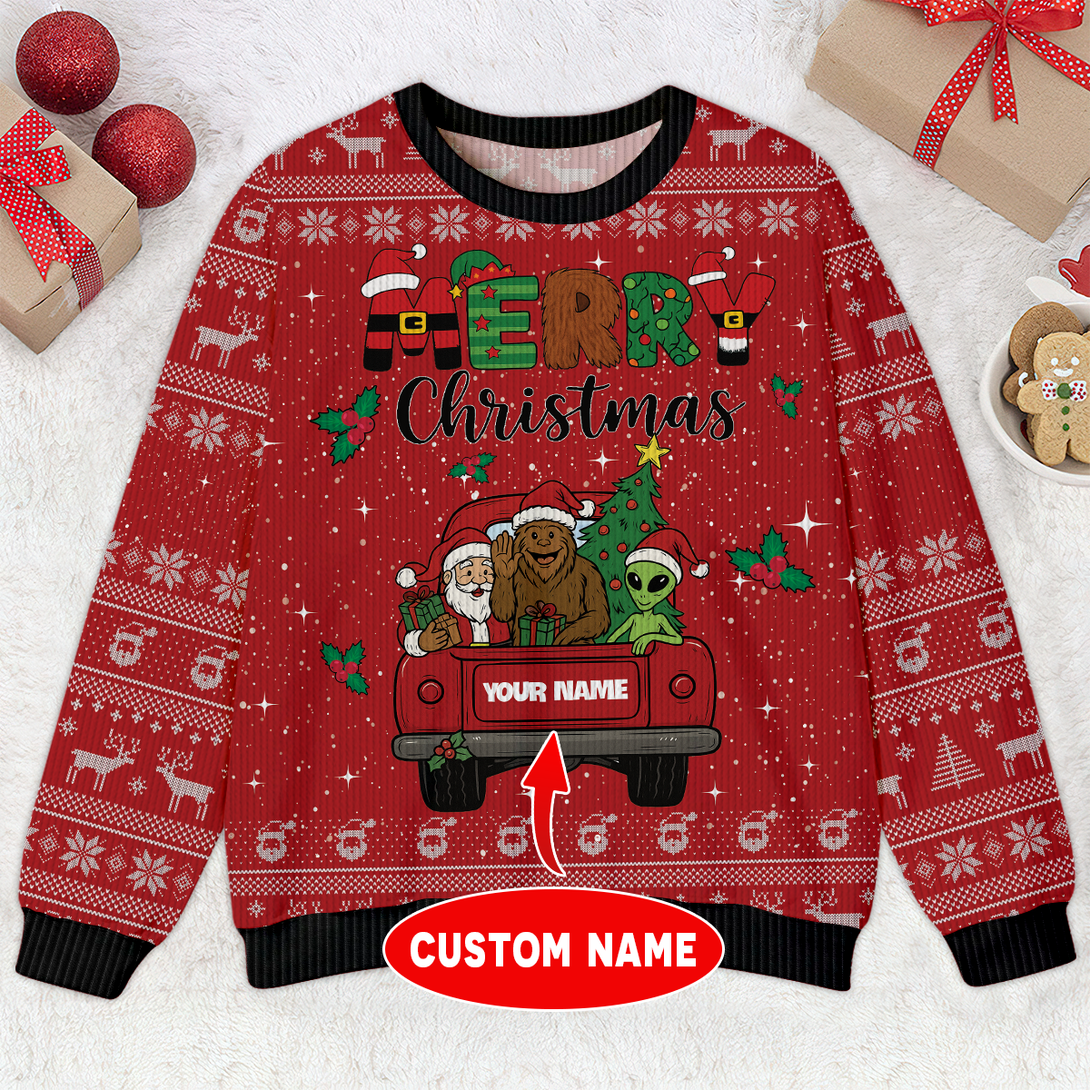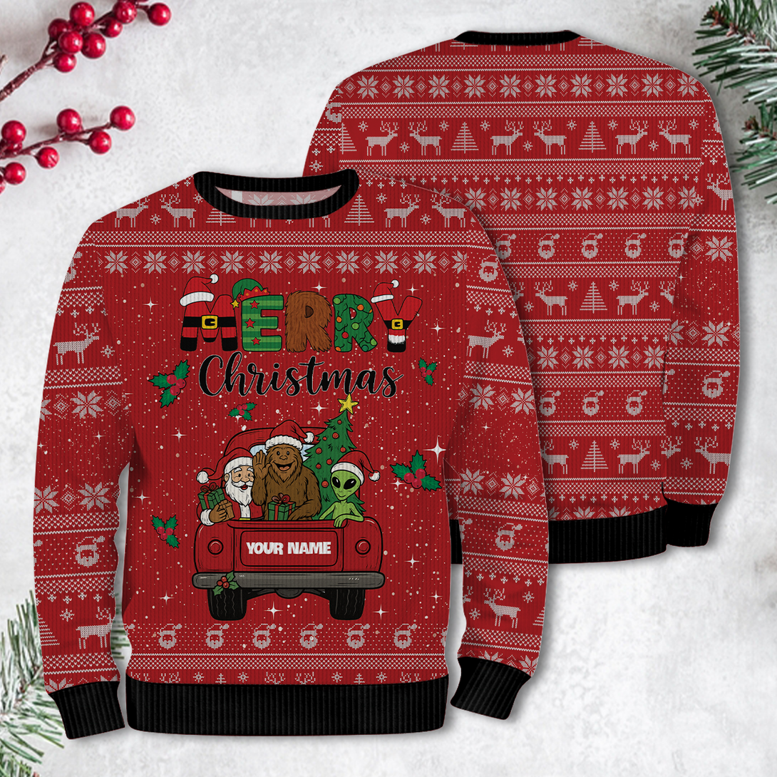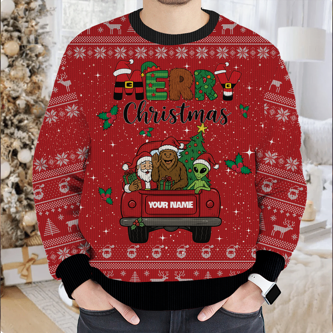 Custom Name Funny Bigfoot Santa & Alien Merry Christmas Ugly Sweater